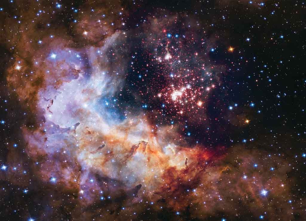 The colossal array is only about 2 million years old and contains some of our galaxy’s most hottest, radiant and massive stars. Some of its biggest stars release a cascade of ultraviolet light and hurricane-force winds of charged particles that etch at the enveloping hydrogen gas.